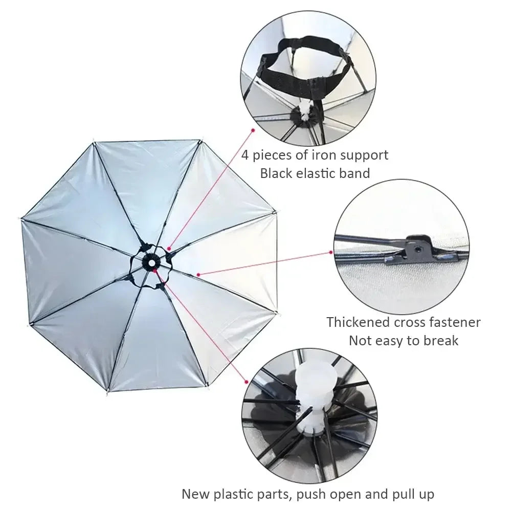 It sounds like you're describing or searching for a foldable outdoor umbrella hat, which is a type of hands-free, wearable sunshade that's especially useful for activities like fishing, camping, hiking, gardening, or beach trips. Here's a breakdown of the features typically associated with this type of hat:
