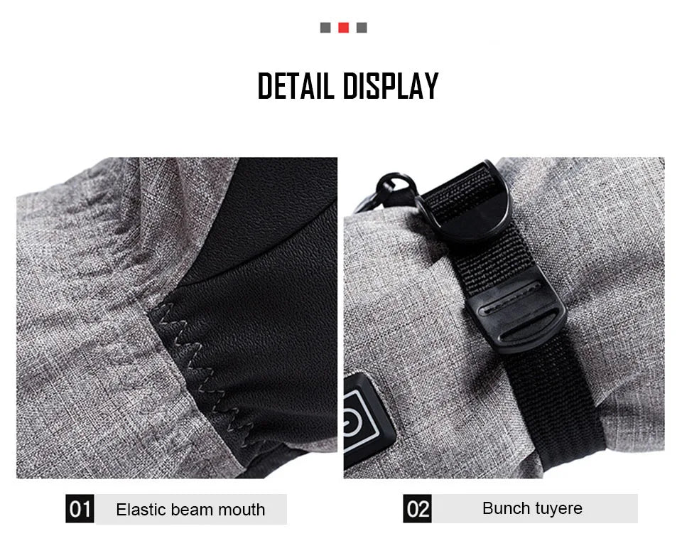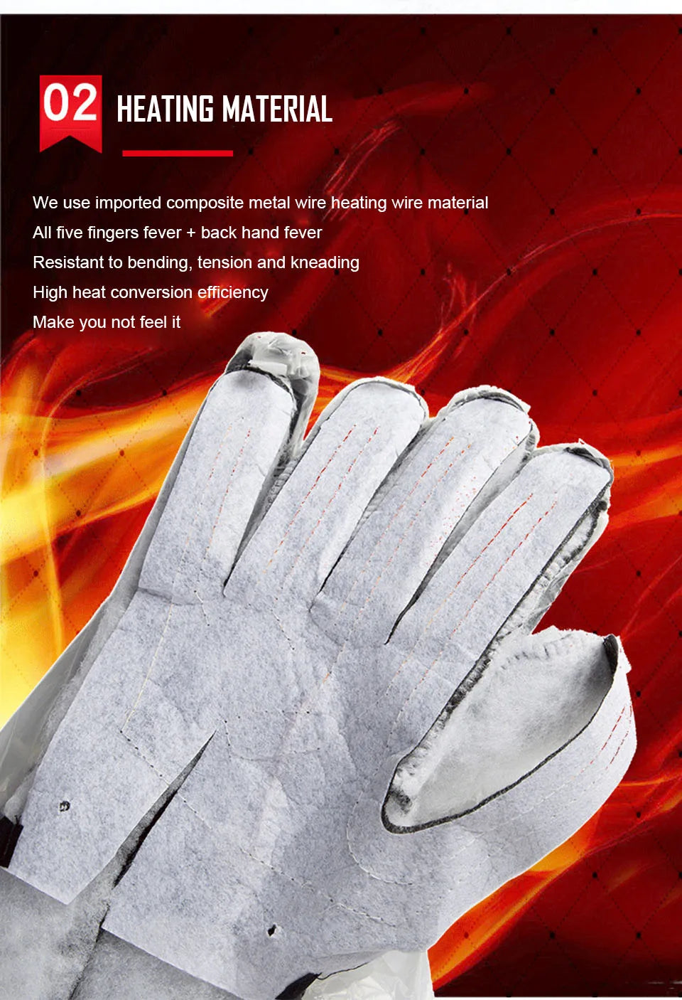 It looks like you're referring to a type of electric heated winter gloves, typically used for outdoor activities in cold weather like snowboarding, cycling, skiing, or motorcycling. Here's a breakdown of the product features based on your description: